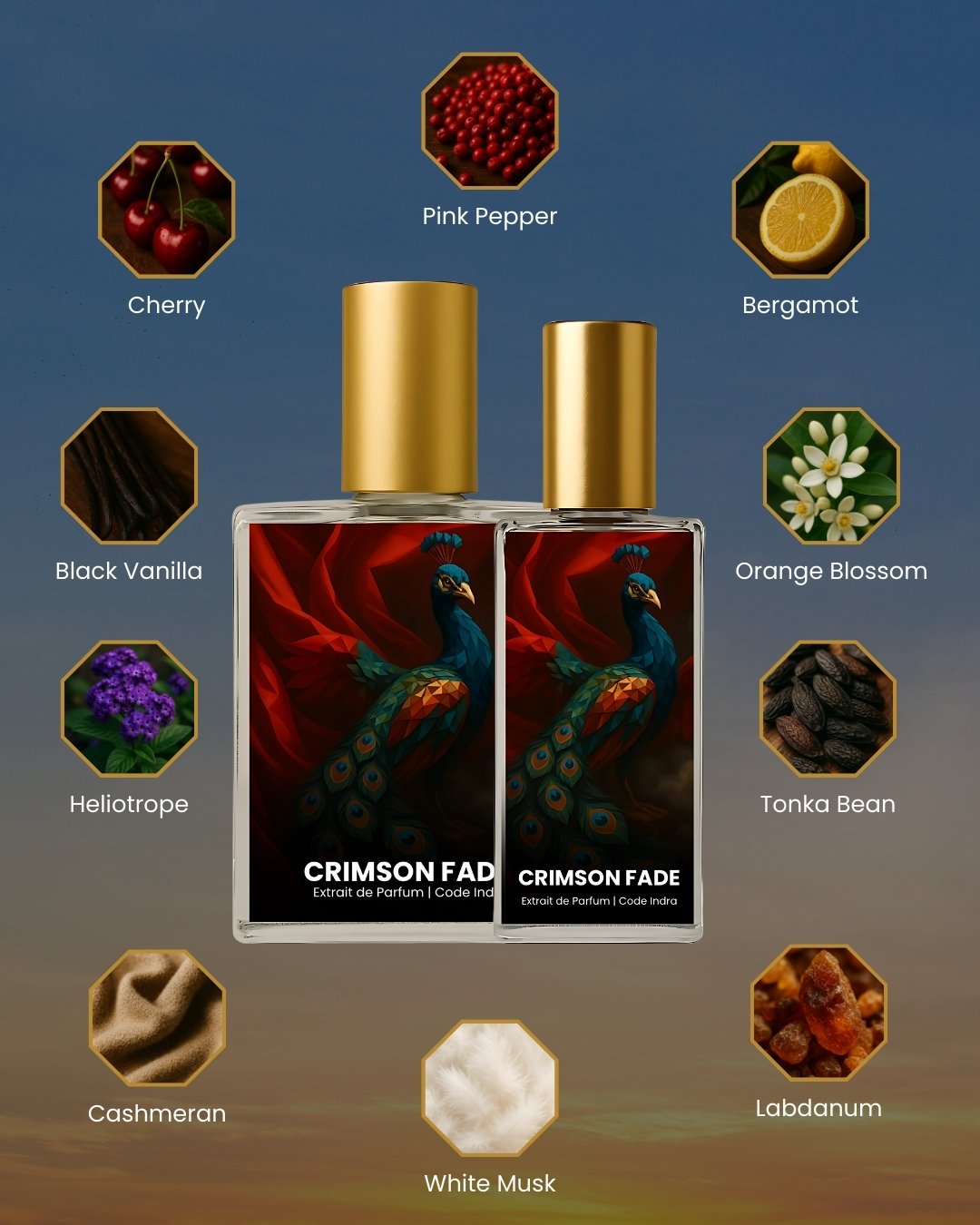 At first spray, Crimson Fade opens with the juicy sweetness of cherry, balanced by the spicy edge of pink pepper and the bright sparkle of bergamot. These top notes create a captivating and lively opening that feels both fresh and luxurious – a first impression that lingers with a refined sweetness and unexpected depth.