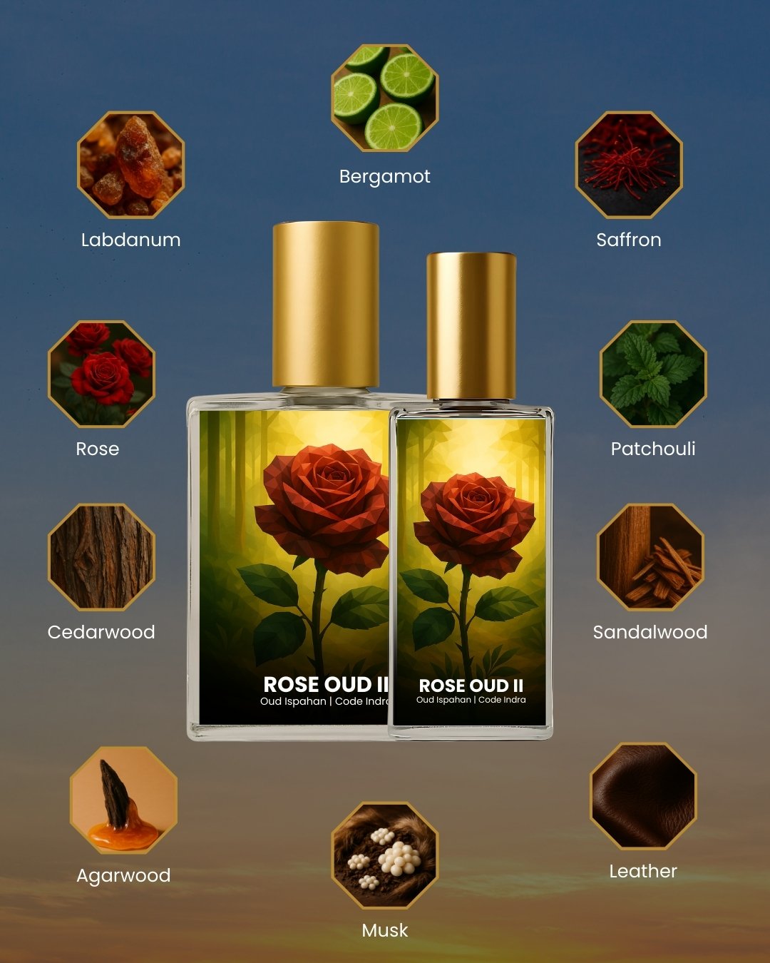 Rose Oud II by Code Indra is our tribute to the legendary Dior Oud Ispahan — a fragrance that redefined luxury florals with oud depth. In this extrait version, the core essence is preserved and enhanced, delivering longer wear, deeper richness, and a performance built for India’s vibrant fragrance culture.